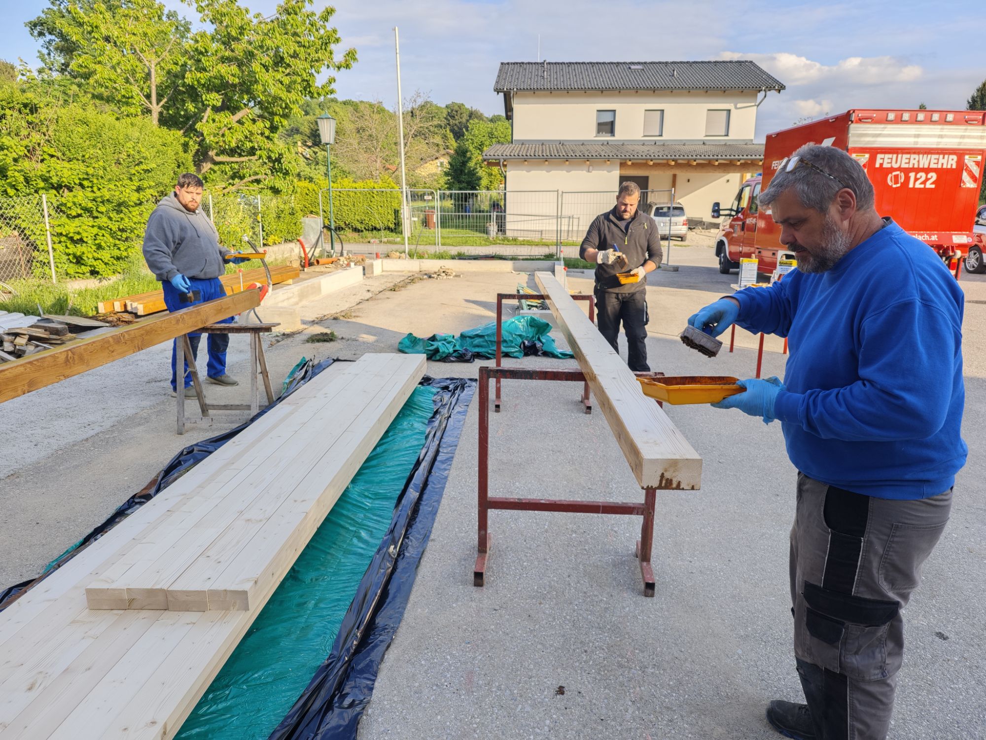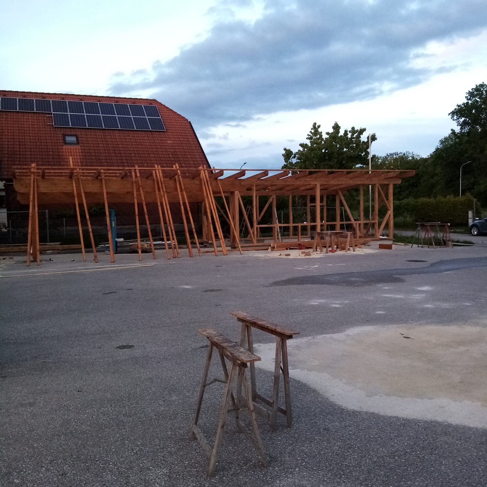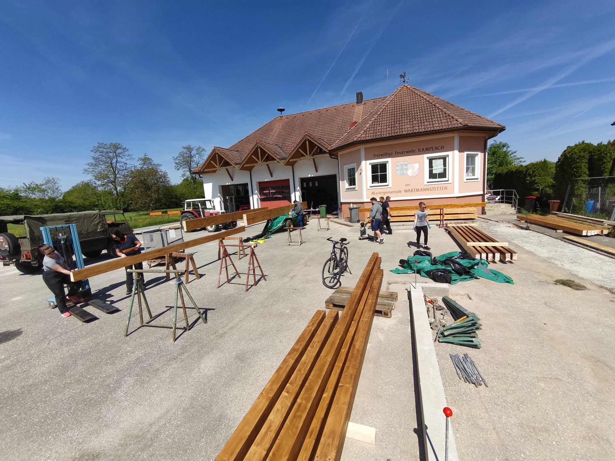 Begonnen wurde mit den Grabungsarbeiten, damit Strom- und Wasserleitungen verlegt werden konnten. Danach folgte das Betonieren der Fundamente. Nach dem Streichen der Holzbalken wurde der Holzbau errichtet und das Dach sowie Regenrinnen montiert. Im Anschluss wurden die Fassadenplatten angebracht und mit der Verlegung der Elektrik begonnen. Damit wir euch auch das Essen und die Getränke durchreichen können, wurden zwei Stk. Rollos montiert.