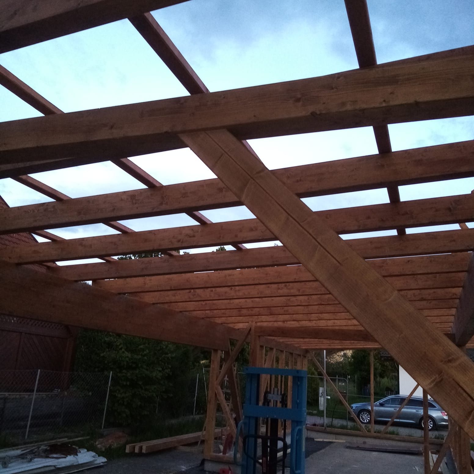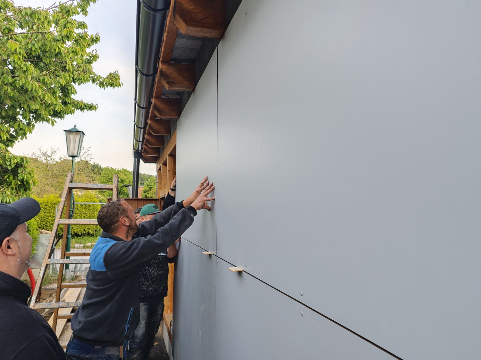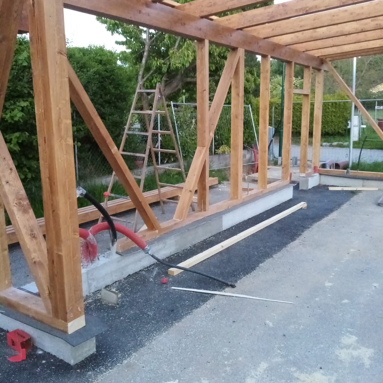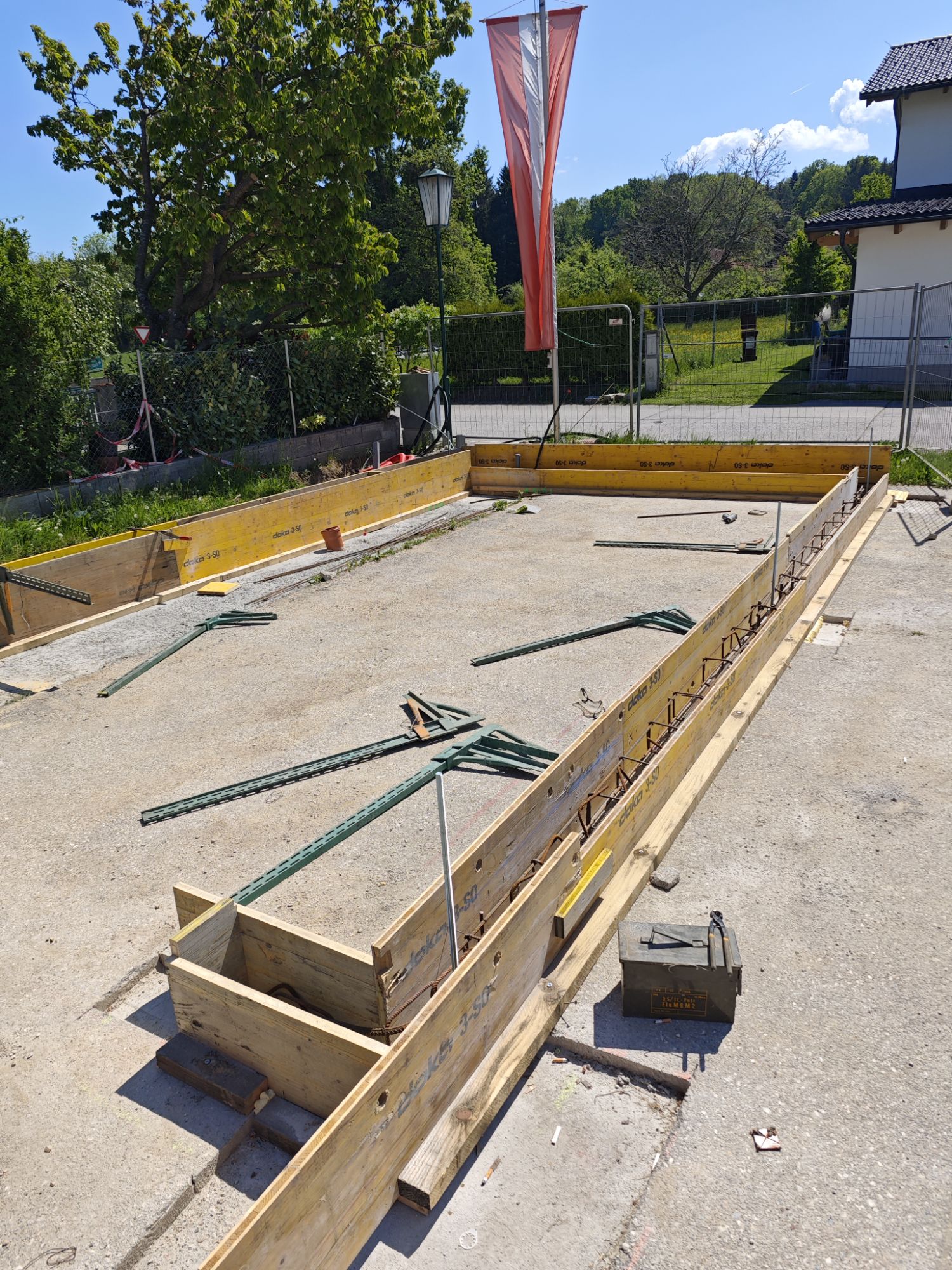 Begonnen wurde mit den Grabungsarbeiten, damit Strom- und Wasserleitungen verlegt werden konnten. Danach folgte das Betonieren der Fundamente. Nach dem Streichen der Holzbalken wurde der Holzbau errichtet und das Dach sowie Regenrinnen montiert. Im Anschluss wurden die Fassadenplatten angebracht und mit der Verlegung der Elektrik begonnen. Damit wir euch auch das Essen und die Getränke durchreichen können, wurden zwei Stk. Rollos montiert.