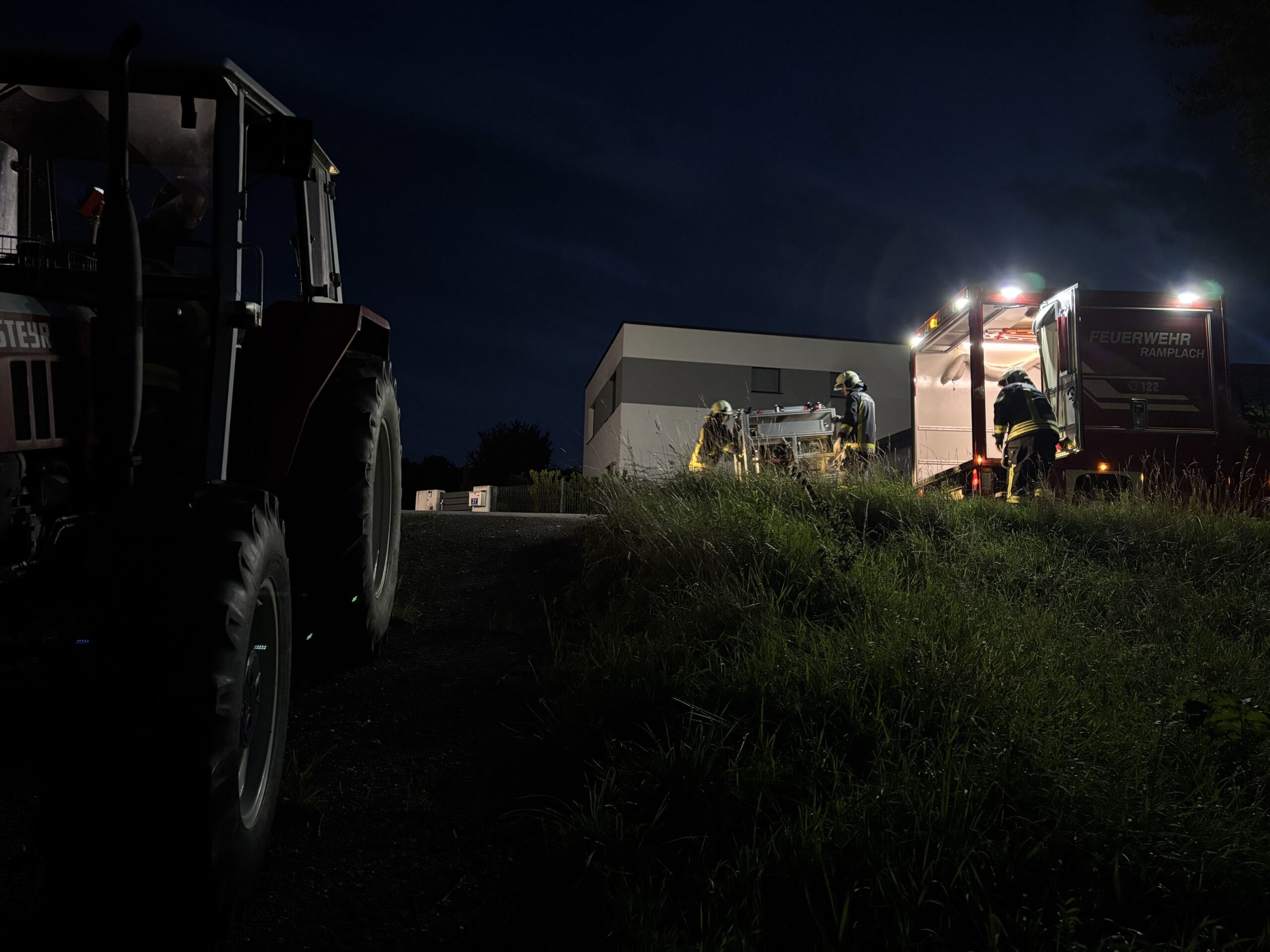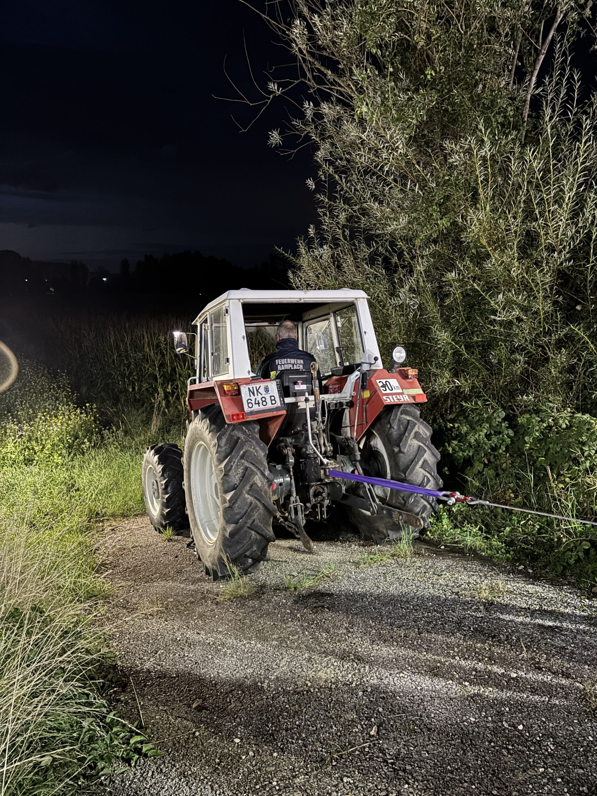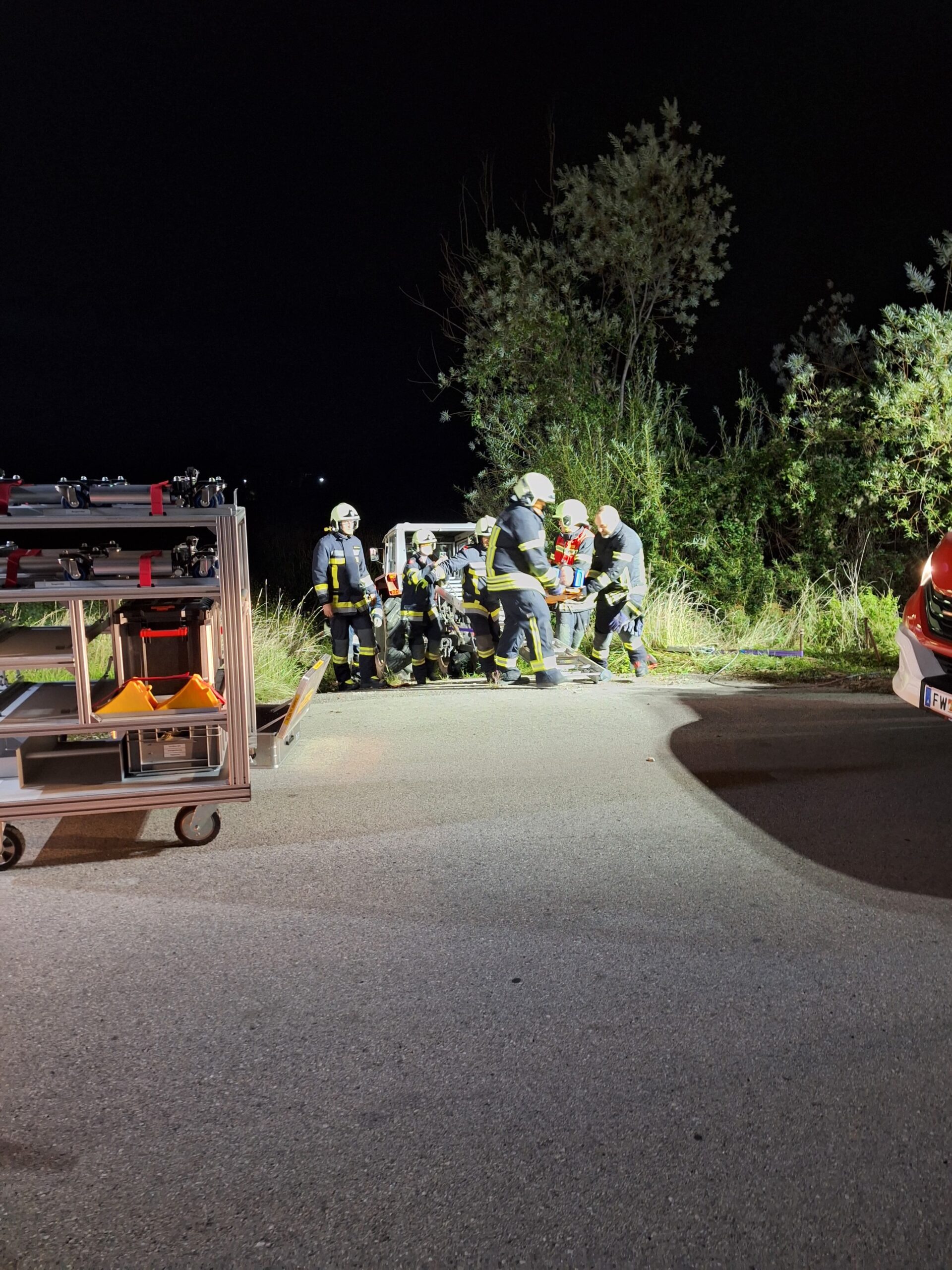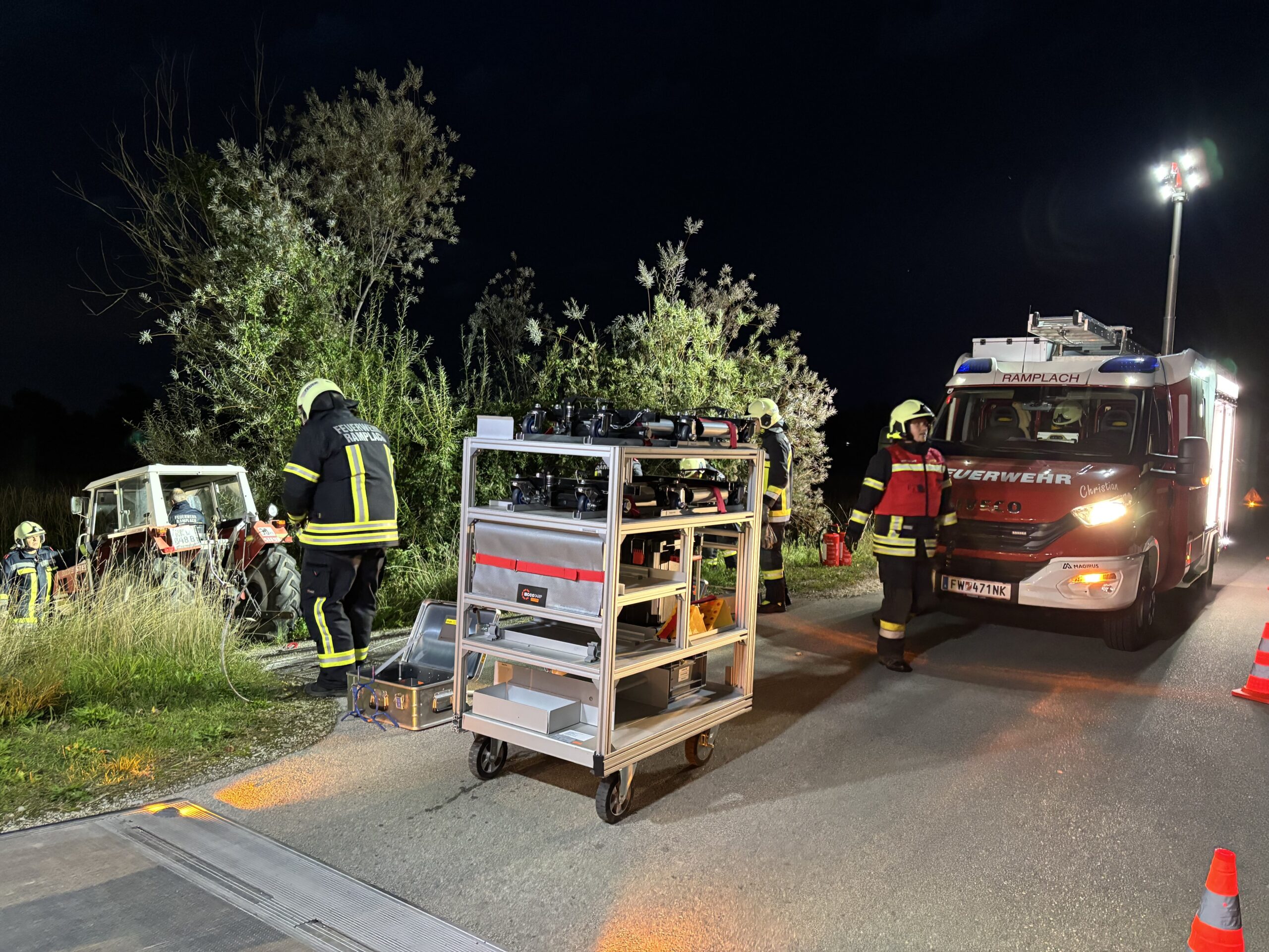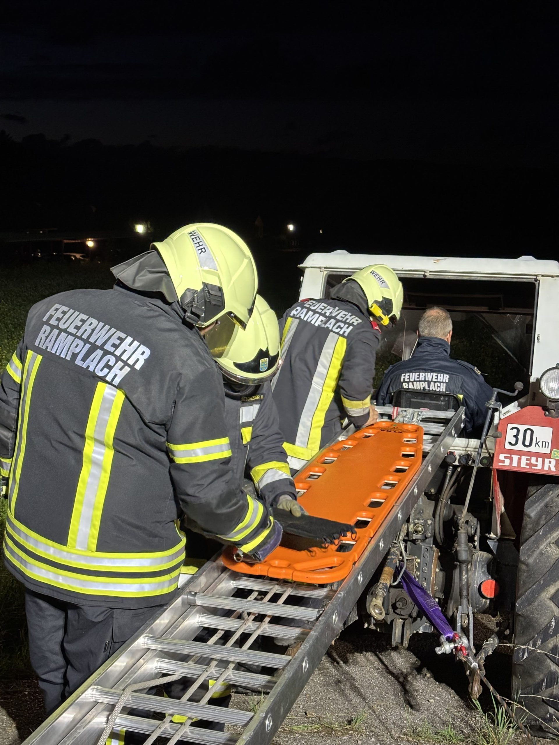 Im Anschluss erfolgte der praktische Teil: Ein Traktor musste mit dem Greifzug gesichert werden, zusätzlich wurde eine Beleuchtung aufgebaut. Zur Rettung der verletzten Person kamen Spineboard und Leiter zum Einsatz. Um die Person schonend aus dem Traktor zu befördern, wurde das Spineboard zunächst auf die Leiter gelegt. Danach konnte die Person aus dem Traktor gehoben, am Spineboard fixiert und schließlich sicher der Rettung übergeben werden.